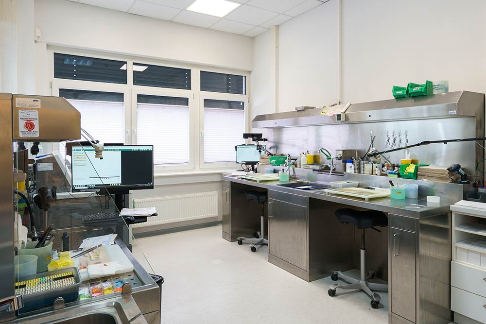 In beiden Standorten setzen wir auf modernste technische Ausstattung: Dazu gehören automatisierte Kapsel- und Slide-Printer, Mikrotome der neuesten Generation sowie leistungsstarke Färbeautomaten. Diese sorgen nicht nur für Effizienz, sondern reduzieren auch die Fehlerquote deutlich. Ersatzgeräte sichern unsere Prozesse zusätzlich gegen technische Ausfälle ab.