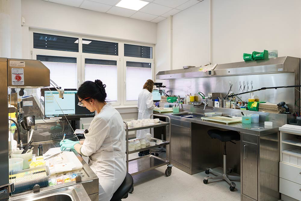 Mit moderner Technik, langjähriger Erfahrung und über 60 qualifizierten Mitarbeitenden stellen wir eine präzise, schnelle Diagnostik sicher – etwa 80 % der histologischen Befunde gehen bereits am Folgetag an die Einsender. Schnellschnitt-Ergebnisse liegen im Schnitt nach 20 Minuten vor.